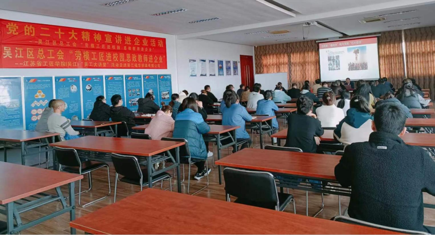根據省委、省政府辦公廳《關于加強和改進新時代江蘇產業工人隊伍思想政治工作的實施意見》文件精神,在全區開展“勞模工匠進校園,思政教師進企業”活動要求,日前公司組織開展以《工匠精神、創新精神和敬業精神》為主題的培訓活動,特邀蘇州信息職業技術學院馬克思主義學院的孟慶彬老師為我們授課,公司全體黨員、2022年技能競賽獲獎產業工人、2023年盛澤鎮最美勞動者近60人參與培訓。
