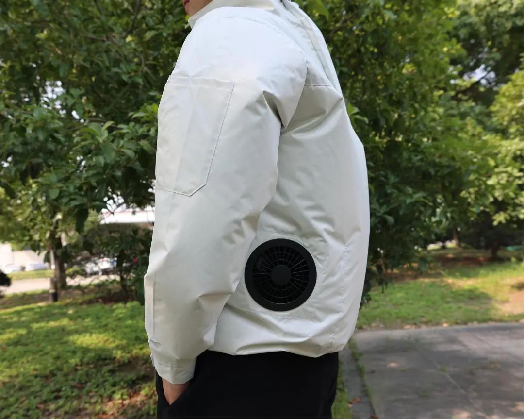 空調服是在上衣的左右腰間處安裝兩個小型風扇,將室外的空氣吸到衣服內,通過汗水蒸發帶走體表的熱量,使身體冷卻,讓人感到涼快舒適。