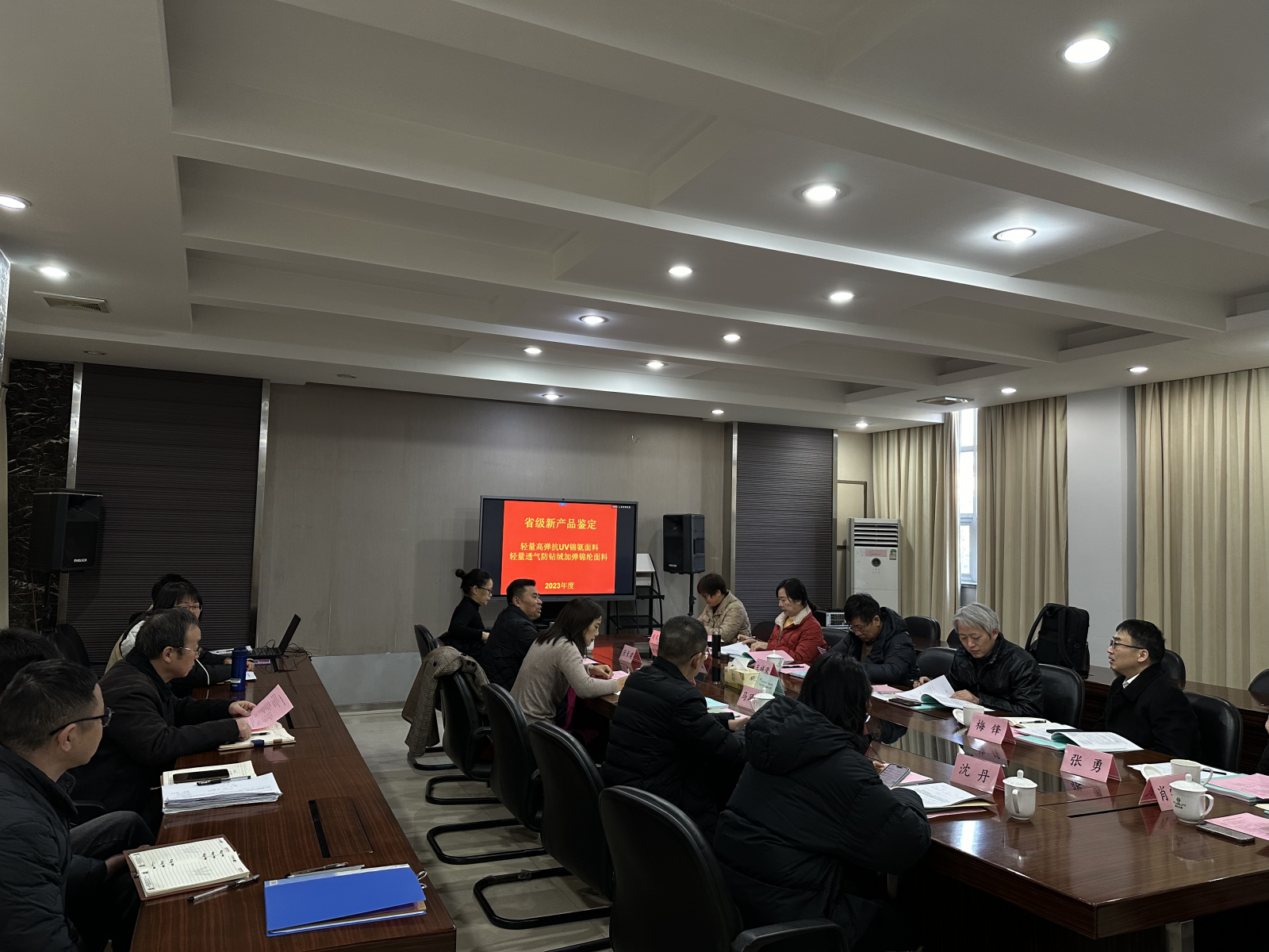 2023年12月17日,受江蘇省工業和信息化廳委托,蘇州市工業和信息化局在吳江組織召開由吳江福華織造有限公司承擔研制開發的新產品鑒定會;此次鑒定產品分別為【輕量高彈抗UV錦氨面料】和【輕量透氣防鉆絨加彈錦綸面料】。